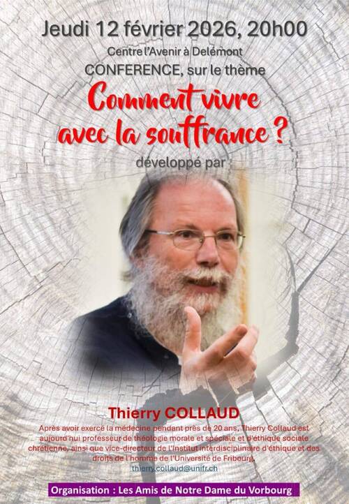 Jeudi 12 février 2026 à 20h00 au Centre l’Avenir à Delémont, conférence de Thierry Collaud avec pour thème « Comment vivre avec la souffrance ? ». Médecin et théologien, il parlera d’un sujet que nous connaissons toutes et tous.